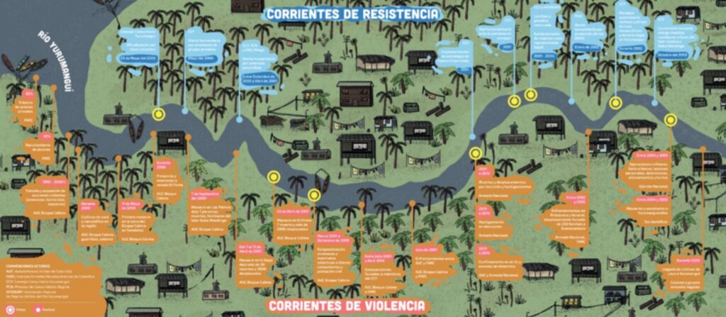 En el corazón del Pacífico colombiano, comunidades afrodescendientes del río Yurumanguí resisten a la minería ilegal, el desplazamiento y la violencia armada mediante la defensa del territorio, la vida comunitaria y la preservación de sus tradiciones ancestrales. A través de herramientas como el ‘Baúl de la memoria histórica’, un micrositio digital, un pódcast y una galería fotográfica’, el Consejo Comunitario fortalece su identidad, dignifica sus liderazgos y construye un legado colectivo junto a las nuevas generaciones, a quienes llaman renacientes.