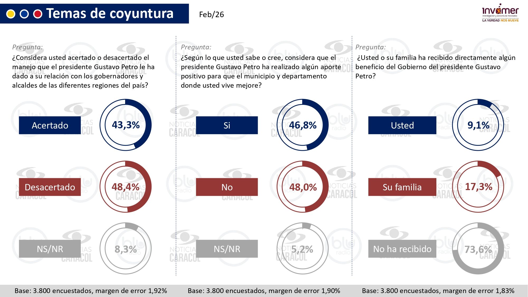 Empresa que realizó la encuesta: INVAMER S.A.S.Persona natural o jurídica que la encomendó: Noticias Caracol y Blu Radio.Fuente de financiación: Noticias Caracol y Blu Radio.Propósito del estudio: conocer la percepción del universo representado según el contenido de este informe y las preguntas textuales que hacen parte del mismo.