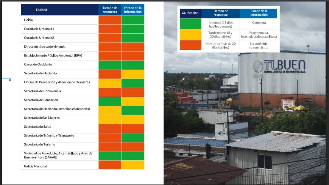 Este tablero evidencia el poco interés en la entrega de la información oportuna y confiable para desarrollar el análisis y valorar gestión y oportunidades de mejora. Se construyó con el ejercicio del informe sobre Calidad de Vida 2023-2024 del programa “Buenaventura Cómo Vamos”, que pertenece a la Red de Ciudades Cómo Vamos, el cual reúne 21 iniciativas que agrupan 41 municipios del país. Socios: Gases de Occidente, Fundación Corona, Fundación Carvajal, Cámara de Comercio, Comité Intergremial, Universidad del Valle, CELSIA.