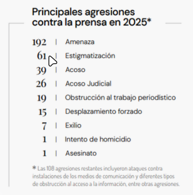 El panorama se vuelve aún más alarmante con las agresiones de mayor impacto. En Quindío, el periodismo perdió a una de sus voces con el asesinato de Óscar Gómez Agudelo; en Guaviare, el periodista Gustavo Chicangana sobrevivió a un intento de homicidio; y en Cali, el edificio donde funcionan tres medios de comunicación (RCN Radio, RCN Televisión y La República) fue blanco de un ataque con explosivos. Estos hechos no ocurrieron de manera aislada: se inscriben en un contexto marcado por la falta de garantías para ejercer el oficio y por respuestas tardías o insuficientes de la institucionalidad frente a las amenazas contra la prensa.