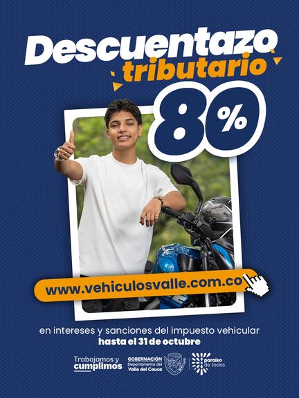 Este alivio que ofrece la Gobernación del Valle del Cauca aplica a rentas departamentales como el impuesto automotor y de registro. El descuento para morosos alcanza el 80%. Hasta el próximo 31 de octubre, los contribuyentes podrán acogerse al ‘Descuentazo Tributario’ y recibir el 80% de descuento en los intereses y sanciones de obligaciones en mora. A la fecha, más de 57.000 pagos se han realizado en el departamento con la medida, que se traduce en un alivio para muchas familias.